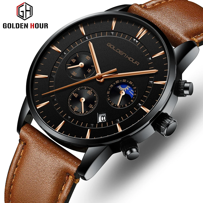 Special Discount GOLDENHOUR Men's Watch Top Brand Luxury Fashion Quartz Watch Men Leather Waterproof Sports Wrist Wa