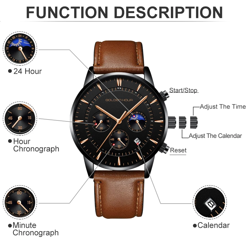 GOLDENHOUR Men's Watch Top Brand Luxury Fashion Quartz Watch Men Leather Waterproof Sports Wrist Wa only US $15.29