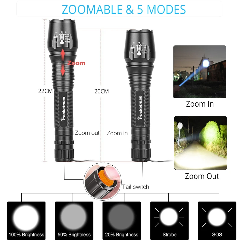 Special Promo Pocketman 5000LM LED Flashlight Ultra Bright Rechargeable Torch linterna Led Flashlight Adjustable